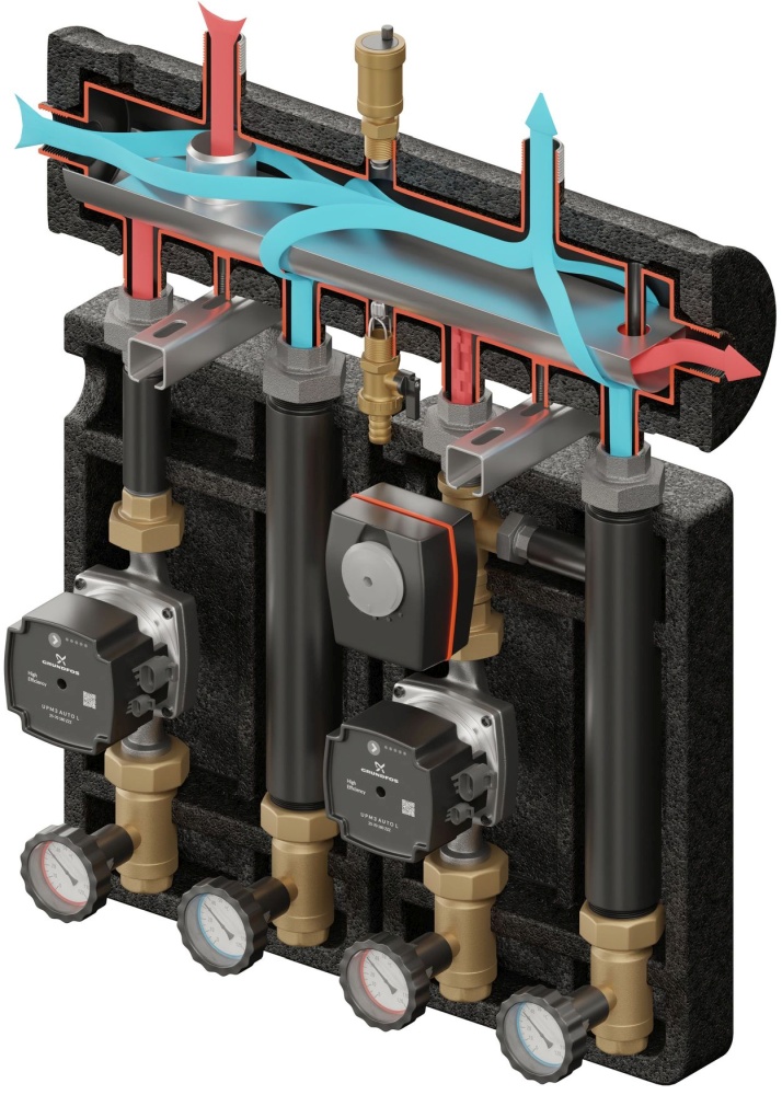 Zestaw hydrauliczny na 2 grupy pompowe z funkcją sprzęgła KOMPANIA 2D+ PRO 460. W zestawie kolektor rozdzielający SKE, grupa pompowa UNI z pompą LFP DN25, grupa pompowa VRG 432 z zaworem obrotowym progresywnym 3 drogowym 1" Kvs do 8.0 z pompą LFP DN25 oraz siłownik ARA.