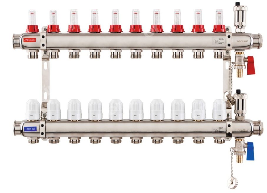 INOX Rozdzielacz ze stali nierdzewnej uzbrojony, 10 obiegów, typ K5, wyposażony w: belki, nyple, zawory termostatyczne, odpowietrzniki