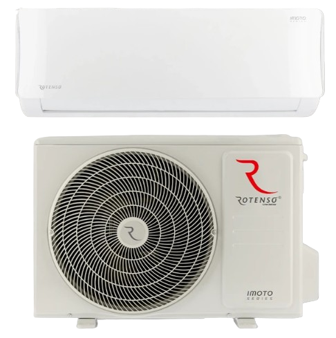 Rotenso Imoto Zestaw klimatyzator jednostka wewnętrzna o mocy 3,5 kW + jednostka zewnętrzna o mocy 3,5 kW. Stanowią komplet. Filtry: HEPA, Cold Nano, elektrostatyczny HD, super Jonizator iAIR, system automatycznego nawiewu 4D. Posiada pakiet dla pracy całorocznej: grzałka tacy ociekowej + grzałka karteru sprężarki.