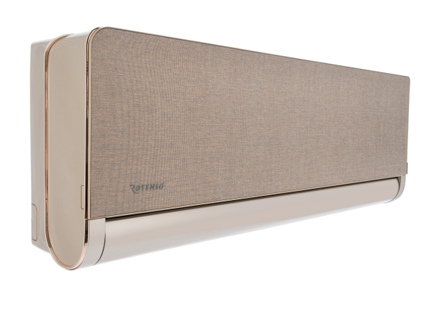 Rotenso Versu Cloth Caramel Zestaw klimatyzator jednostka wewnętrzna o mocy 3,5 kW + jednostka zewnętrzna o mocy 3,5 kW. Stanowią komplet. Obudowa jednostki wewnętrznej jest w kolorze złotym z złotymi zdobieniami i wymiennymi panelami materiałowymi. Smart WIFI. Sprężarka rotacyjna DC. System automatycznego nawiewu 4D. Posiada pakiet dla pracy całorocznej: grzałka tacy ociekowej + grzałka karteru sprężarki.