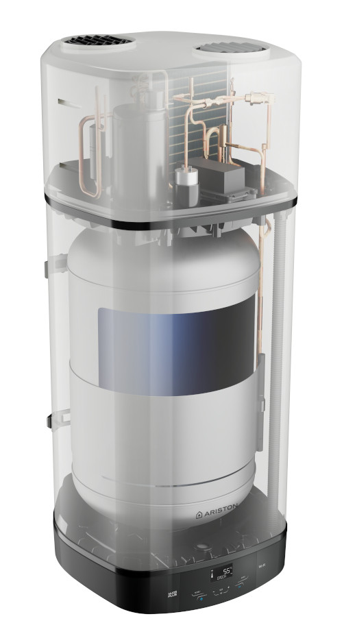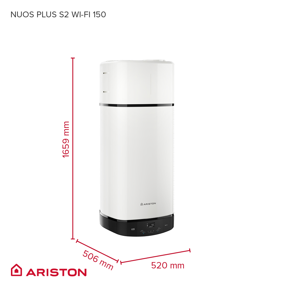 Ariston NUOS PLUS S2 WI-FI 150 WH wiszący podgrzewacz wody z pompą ciepła, pokryty emalią tytanową, z aktywną i magnezową anodą oraz emaliowaną grzałką.